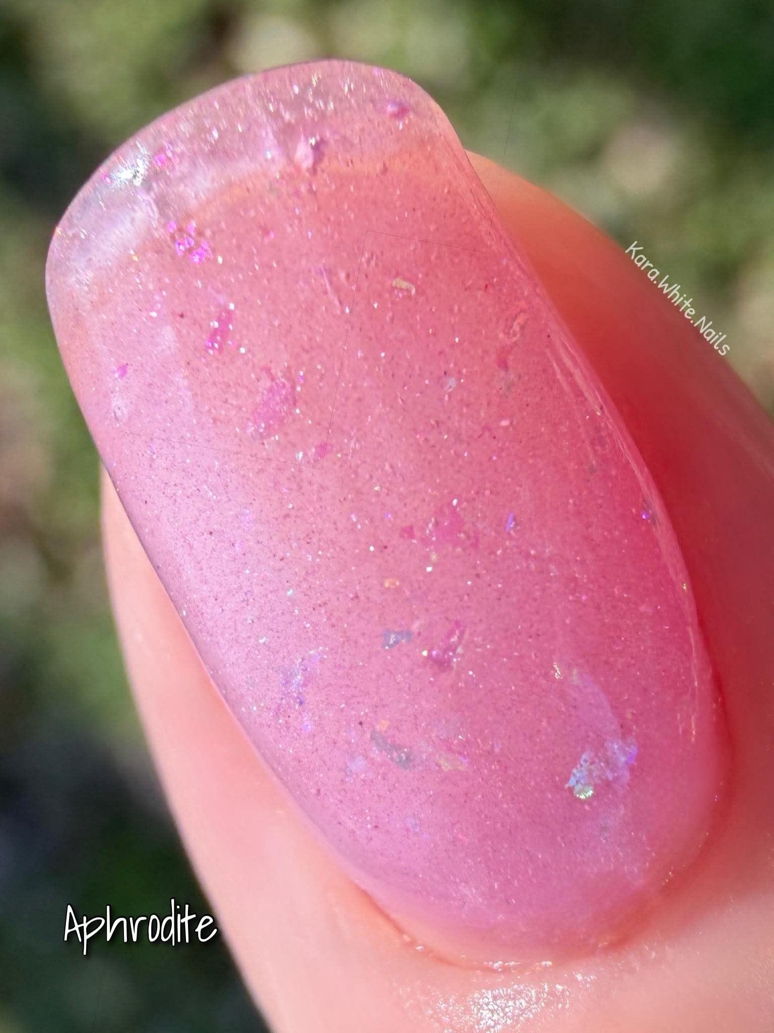 Aphrodite is a pink sheer dip with multi-colored flakies throughout.