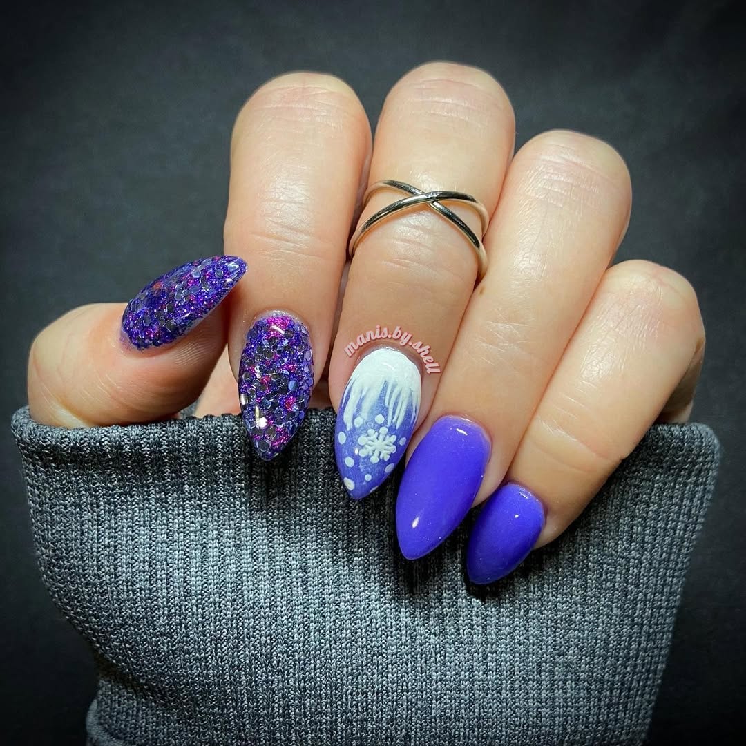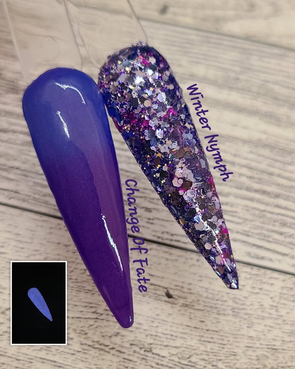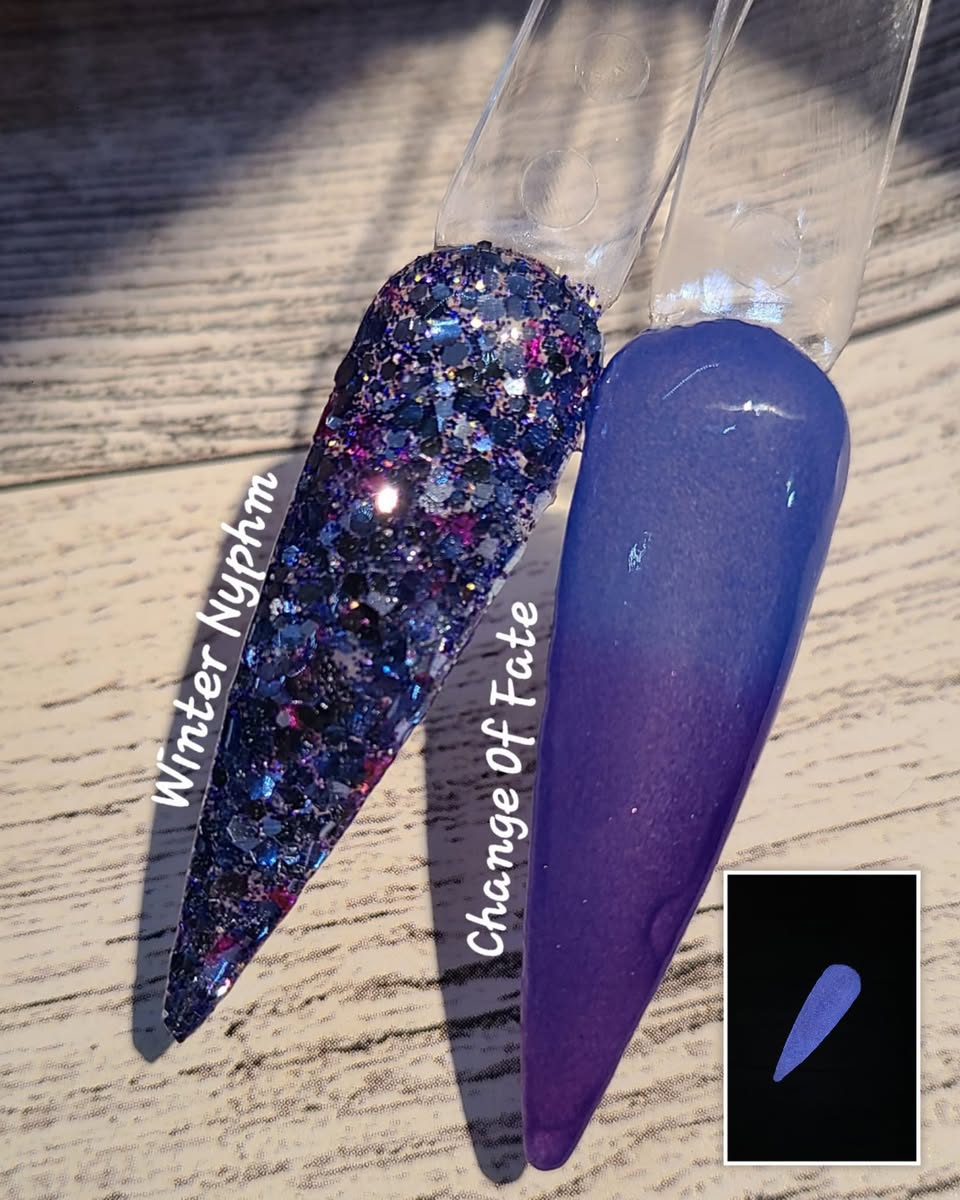 December's birthday duo has a stunning blue/purple shifting glitter and a thermal dip that changes from blue (warm) to purple (cold) and glows white!