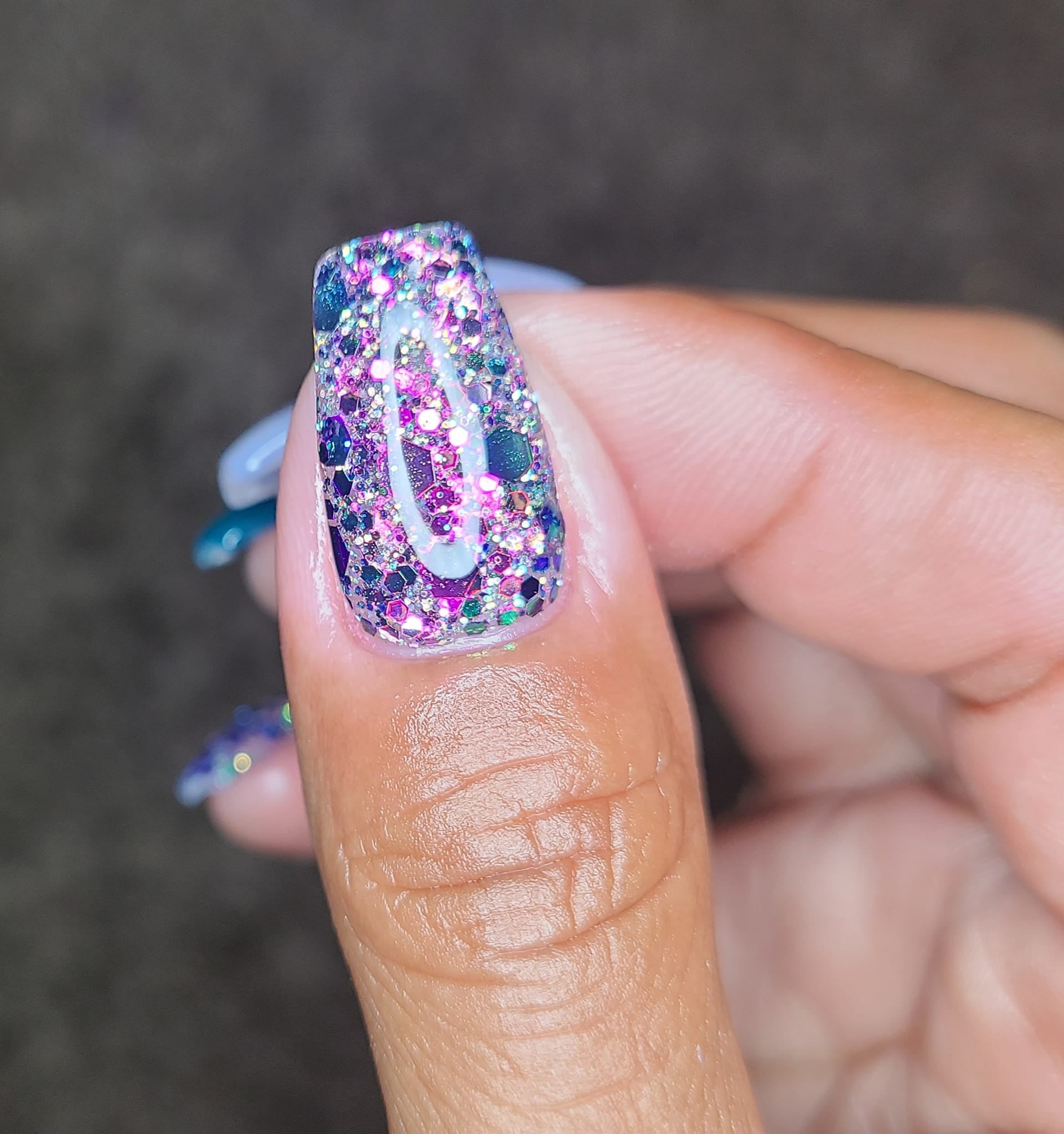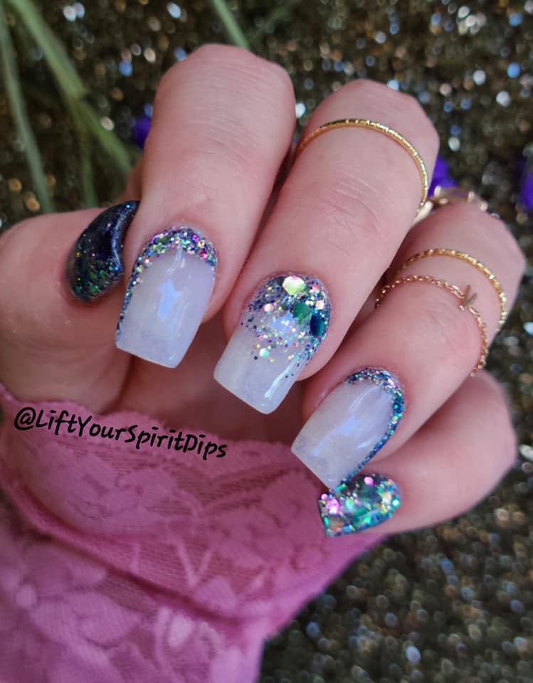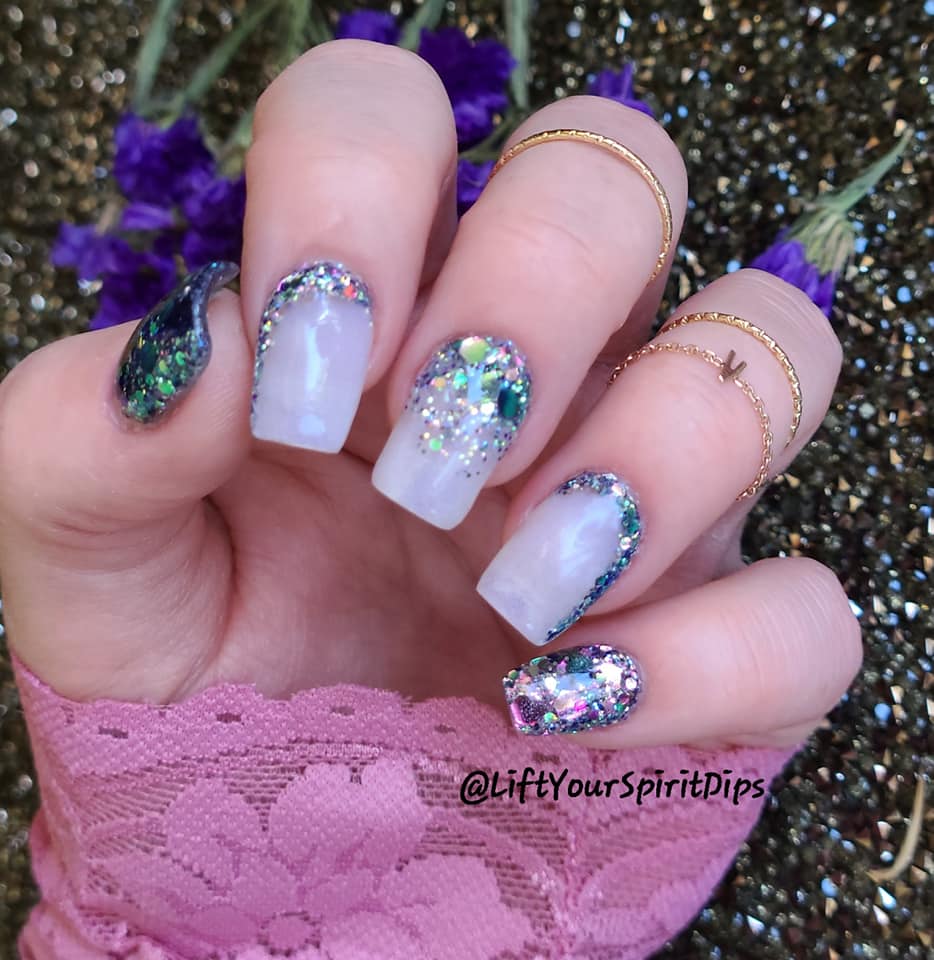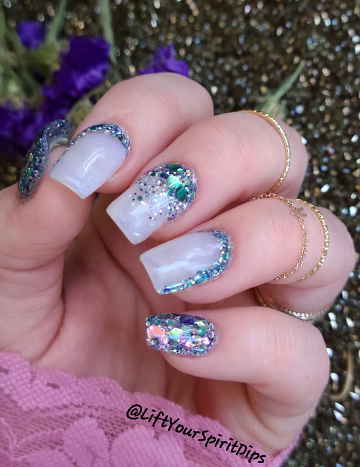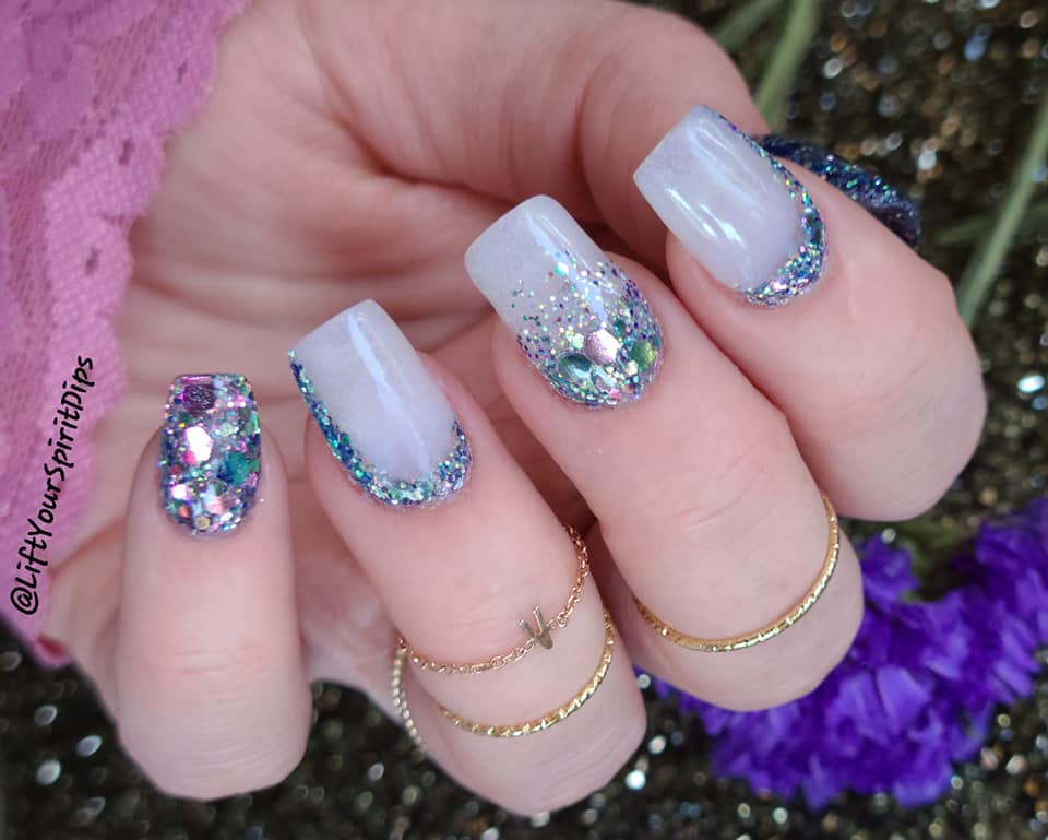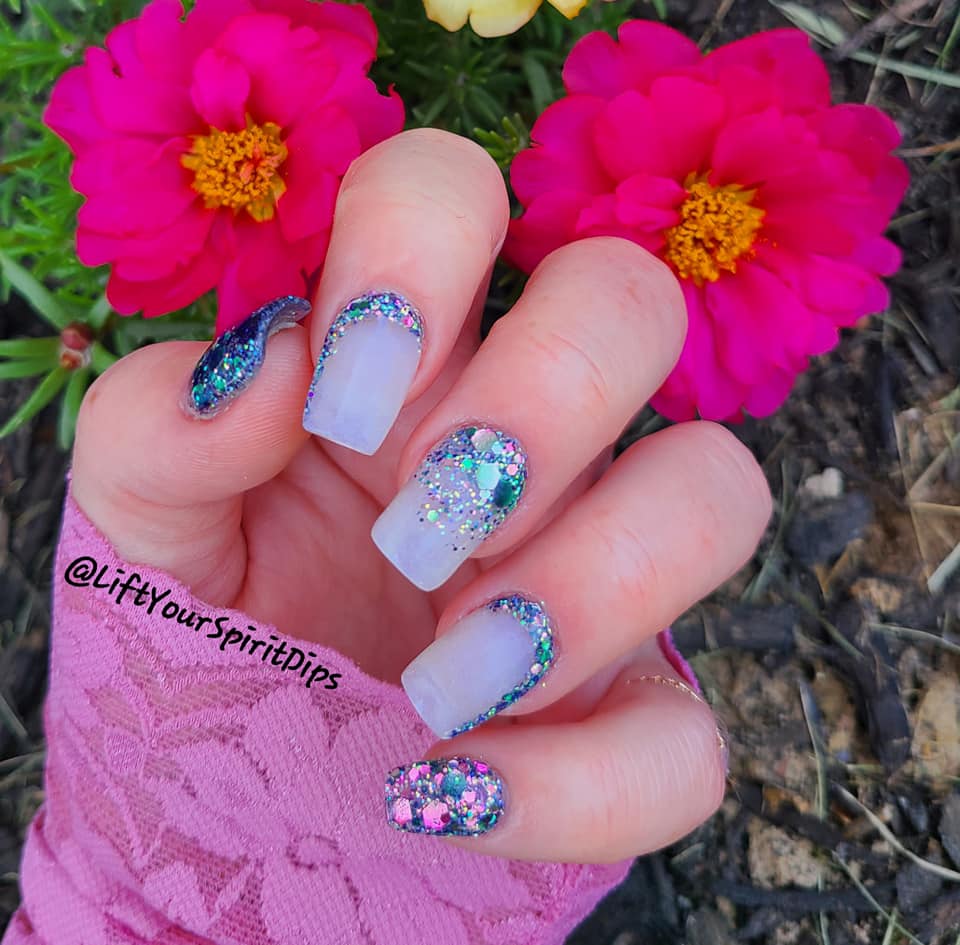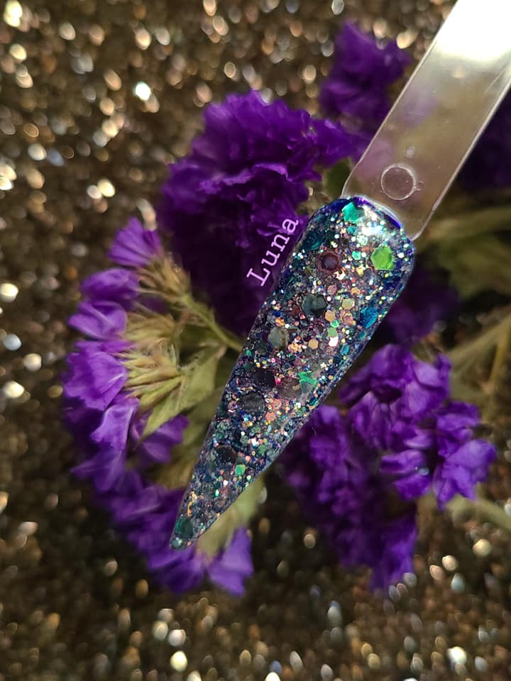 The June Birthday Duo consists of 2 dips: Luna (chunky, multi-colored glitter mix) and Moon-Stone (a purple translucent pearlescent dip).