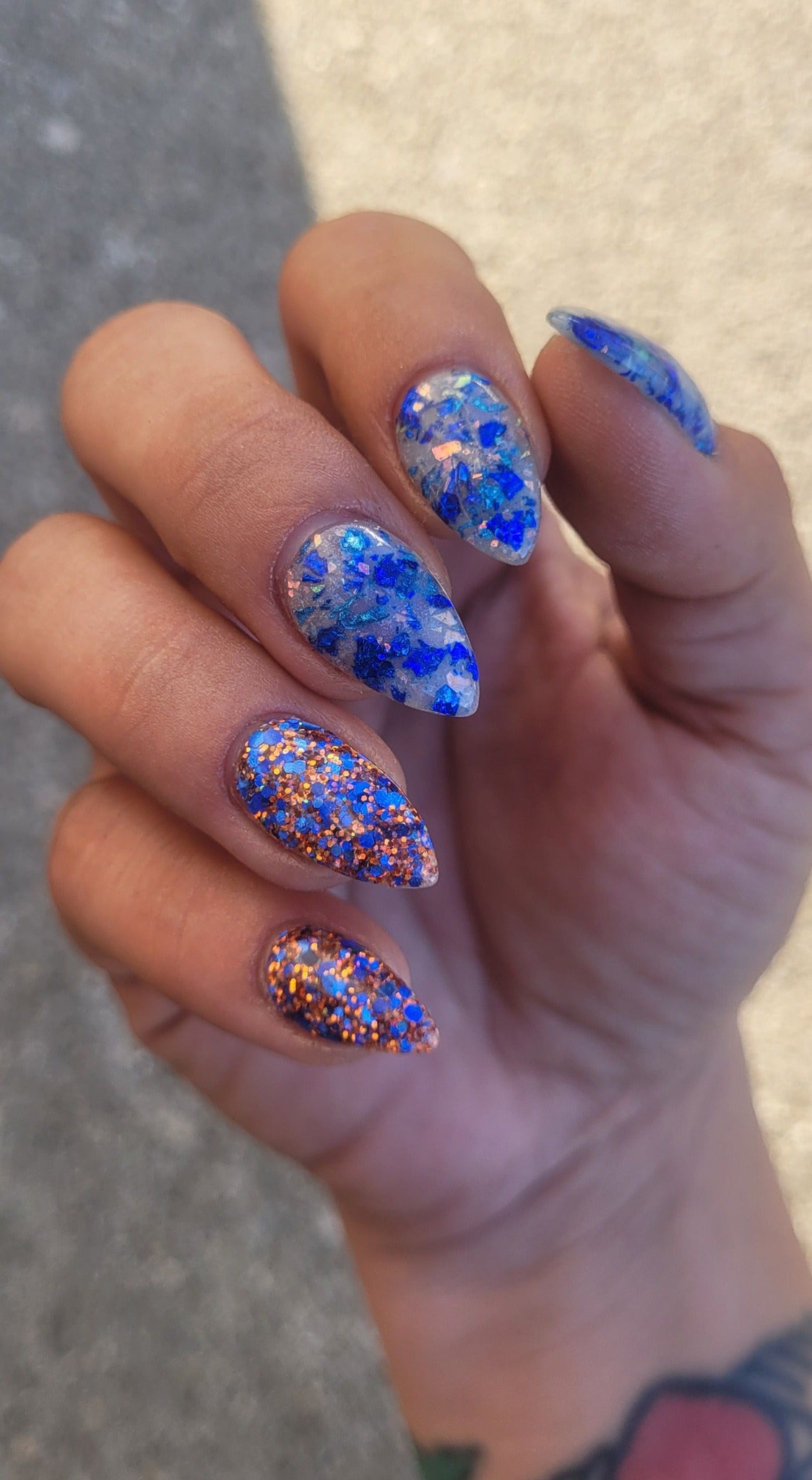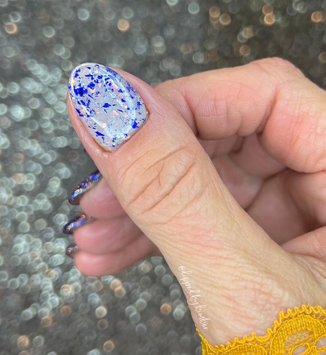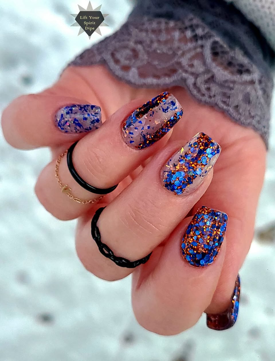 November Birthday duo is made up of a medium chunky glitter and a foil/flake dip.